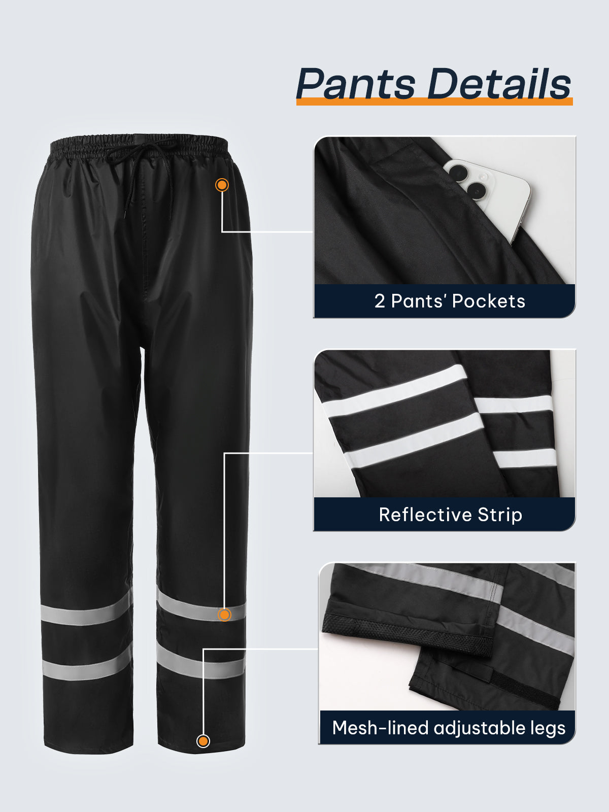 • [Bottom Pants]: Two wide-reflective stripes keep you visible in rainy daytime and nighttime, adjustable to pants bottom with Viscose, two big side pockets, elastic waistband with adjustable string for comfortable/personalized fit.